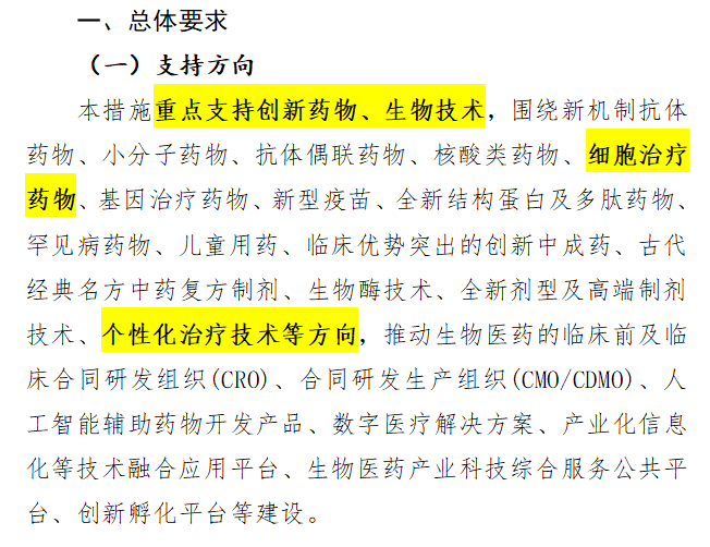《措施》總體要求,重點支持創(chuàng)新藥物、生物技術(shù),圍繞…細(xì)胞治療藥物、基因治療藥物、新型疫苗……個性化治療技術(shù)等方向的發(fā)展。
